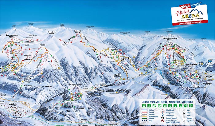 Het skigebied van de Zillertal Arena (1470 -2302 m) bereikt u via de Gerlospass richting Krimml/Hochkrimml in ongeveer 15/20 autominuten. Vanaf Hochkrimml – de Gerlosplatte – heeft u aansluiting op het grootste skigebied van het Zillertal Arena met 51 moderne skiliften, 166 km pisten waarvan 10 km zwart, 114 km rood en 42 km blauw. De 216 ha besneeuwde pistes van het Zillertal Arena zijn het gehele seizoen sneeuwzeker.